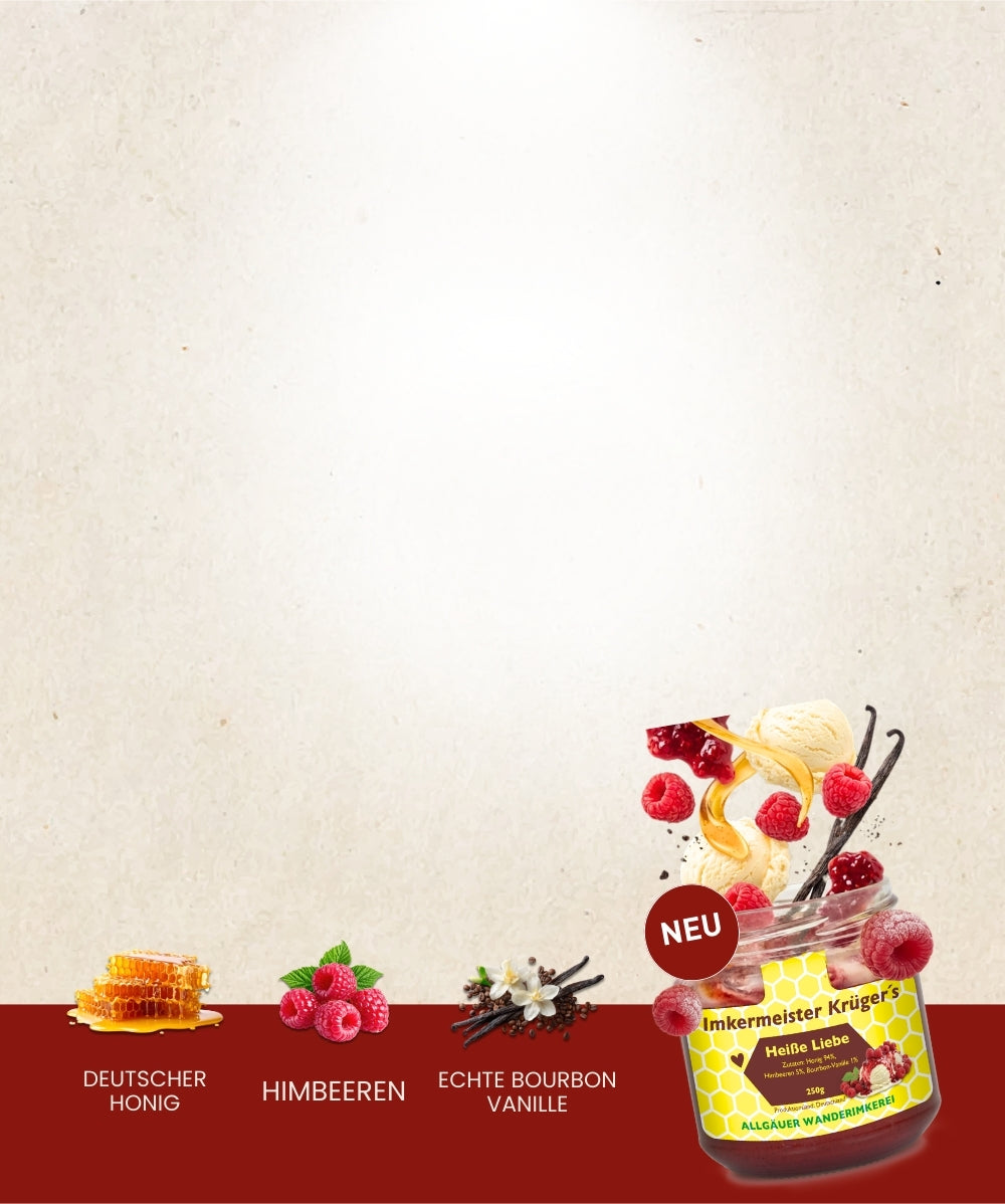 Liebe zum Löffeln: Erlebe unseren neuen „Heiße Liebe“ Honig mit Himbeeren und echter Bourbon-Vanille. Zartcremig, süß-fruchtig und unwiderstehlich lecker.