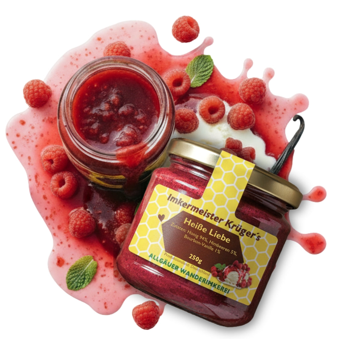 Liebe zum Löffeln: Erlebe unseren neuen „Heiße Liebe“ Honig mit Himbeeren und echter Bourbon-Vanille. Zartcremig, süß-fruchtig und unwiderstehlich lecker.