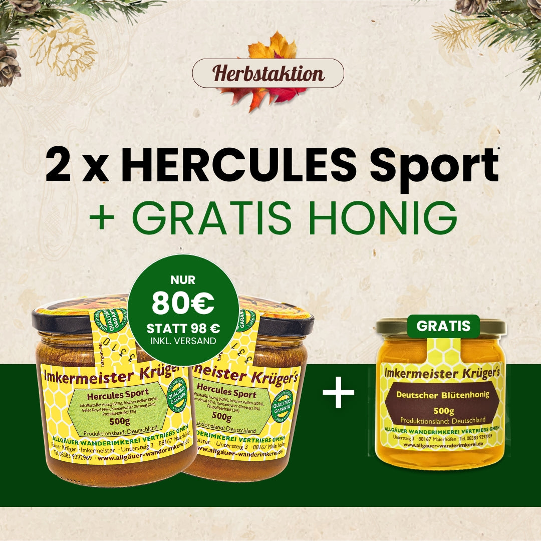HERCULES besteht aus einer Mischung aus Bienenhonig, Wildblütenpollen, Gelee Royal (Royale) und Propolis-Extraktpulver. Das Besondere daran ist der erntefrisch tiefgefrorene Blütenpollen, denn dieser wird bei der Ernte nicht getrocknet, sondern direkt verarbeitet. Die Wirksamkeit von erntefrischem, tiefgefrorenen Pollen ist gegenüber dem getrockneten Pollen fünfmal so stark.