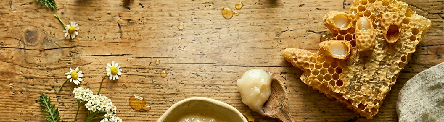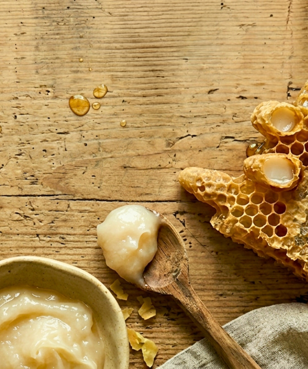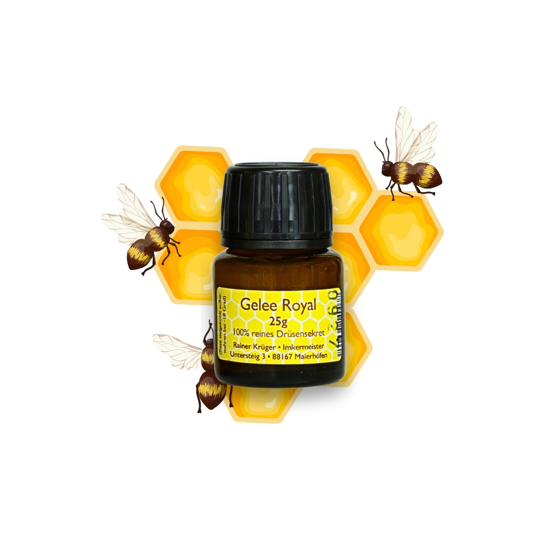 Gelee Royal ist eine cremige, milchig-weiße Substanz, die von jungen Arbeitsbienen produziert wird, um die Königin und die jungen Larven zu ernähren. Es ist reich an Proteinen, Zucker, Fetten sowie Vitaminen und Mineralien und fördert die außergewöhnliche Langlebigkeit und Größe der Bienenkönigin.