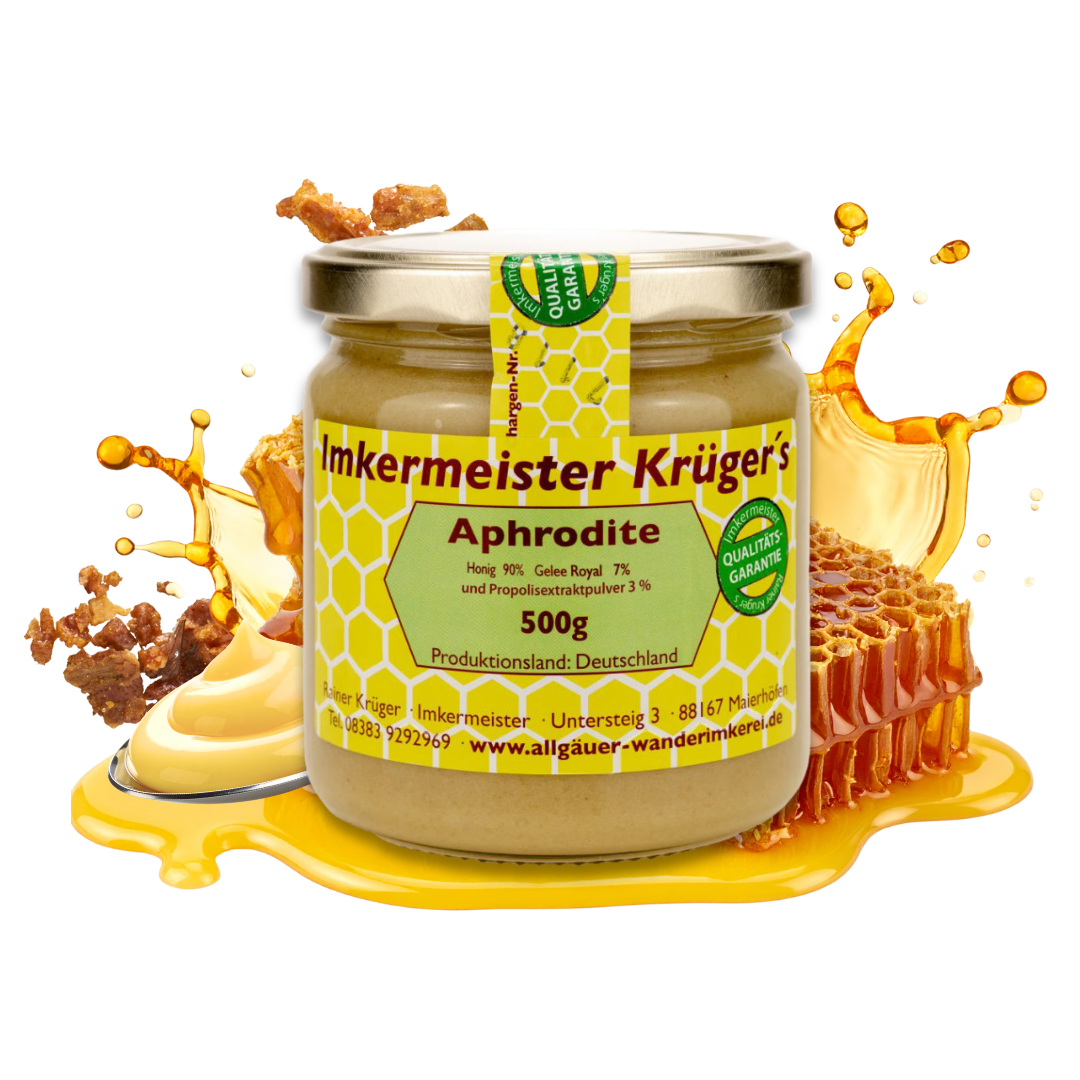Unsere Bienenspezialität Aphrodite enthält hochwertiges Gelee Royal (Royale), Propolisextrakt und Honig – Naturprodukt.