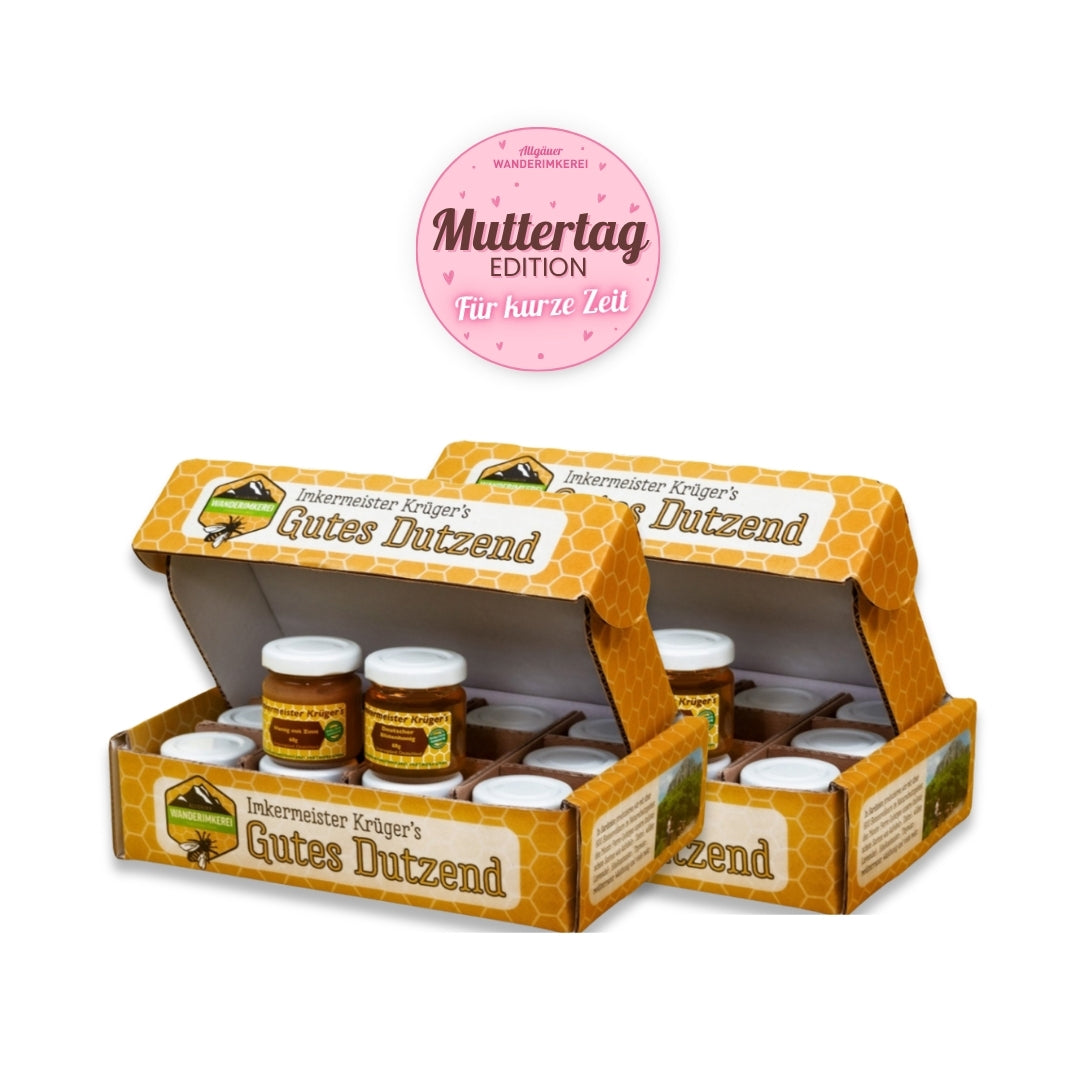 Hol Dir zweimal das einzigartige Honig-Probierset Gutes Dutzend mit 12 ausgewählten Honigen zu jeweils 60g und spare 10% Rabatt – nur zum Muttertag.