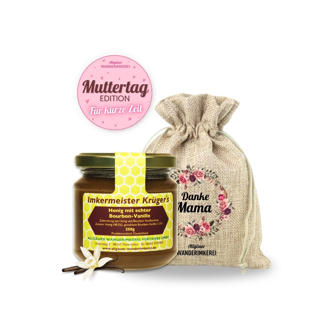 Honig mit echter Bourbon-Vanille (250g), ein harmonisches Duo aus deutscher Imkerkunst und exotischer Vanille. Liebevoll verpackt im Leinensäckchen „Danke Mama“. Ein Honig mit absolutem WOW-Effekt.