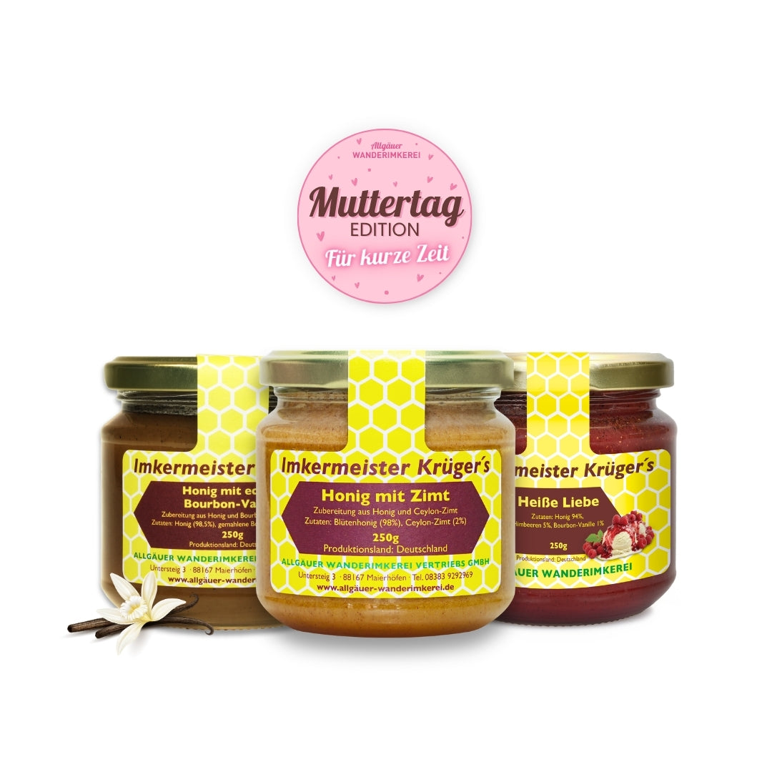 Verschenke dieses Jahr etwas Besonderes an Deine Mutter: das exklusive Mamas Honig-Lieblinge-Set, bestehend aus dem beliebten Honig mit echter Bourbon-Vanille, Honig mit Zimt und dem leckeren Heiße Liebe Honig mit Himbeeren und echter Bourbon-Vanille. 10% Rabatt nur zum Muttertag.
