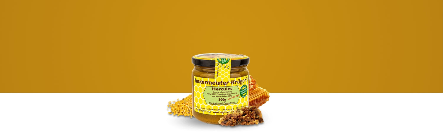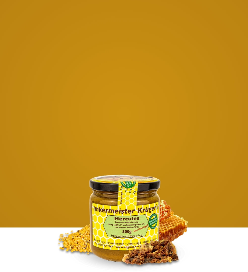 HERCULES besteht aus einer Mischung aus Honig, erntefrisch, tiefgefrorenen Blütenpollen und Propolis-Extraktpulver. Das Besondere daran ist der erntefrisch, tiefgefrorene verarbeitete Blütenpollen, denn dieser wird bei der Ernte nicht getrocknet, sondern direkt tiefgefroren. Die Wirksamkeit von frischem Pollen ist gegenüber dem getrockneten Pollen fünfmal so stark, das kombiniert sehr gut mit den weiteren Inhaltsstoffen wie Propolis-Extraktpulver.