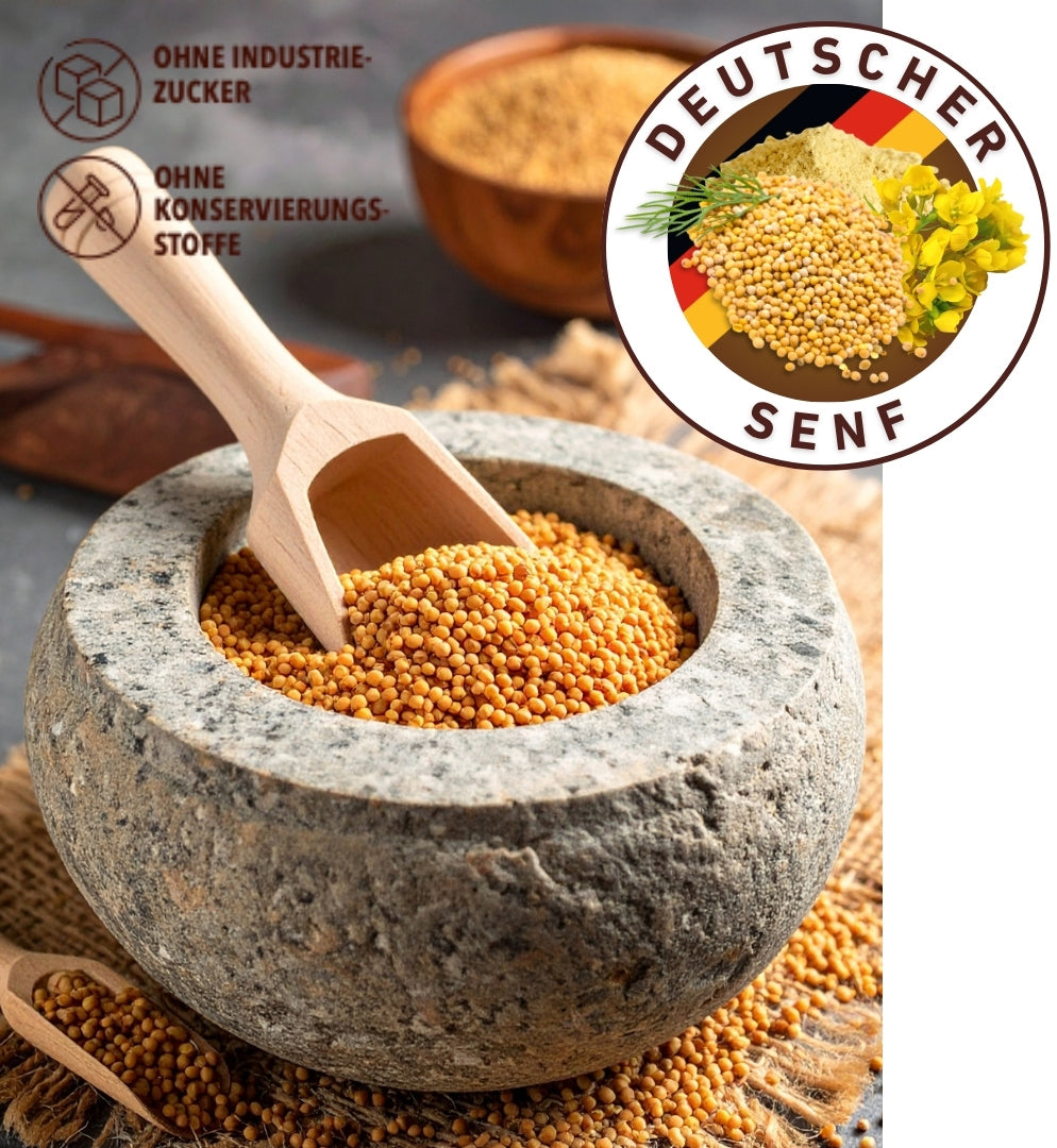Unser deutscher Senf wird noch heute traditionell auf Steinen gemahlen – schonend und aromaerhaltend unter 50 50 °C. So werden die kostbaren Senföle und natürlichen Inhaltsstoffe vollständig bewahrt. Nur durch diese traditionelle Verarbeitung bleibt unser Senfmehl in seiner ursprünglichen Form – ideal zum Verfeinern und seit jeher für die Verdauung geschätzt. Nicht homogenisiert, nicht entschärft – einfach echt.
