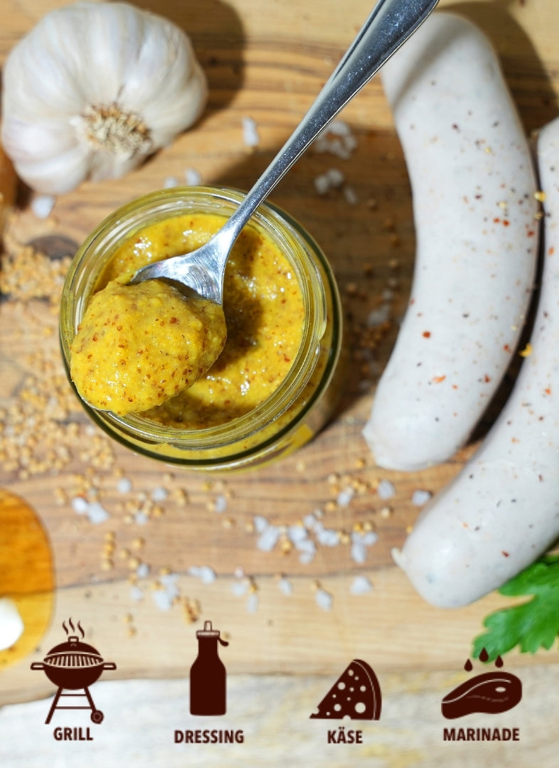 Wir im Allgäu lieben unsere Weißwurst – am liebsten mit unserem hausgemachten Honig-Senf. Die ausgewogene Balance zwischen der milden Wurst und der würzig-süßen Senfnote macht jeden Bissen zu einem Genuss, der nach mehr verlangt. Passt natürlich auch perfekt zu jedem anderen Fleisch-, Wurst- oder Käsegericht.